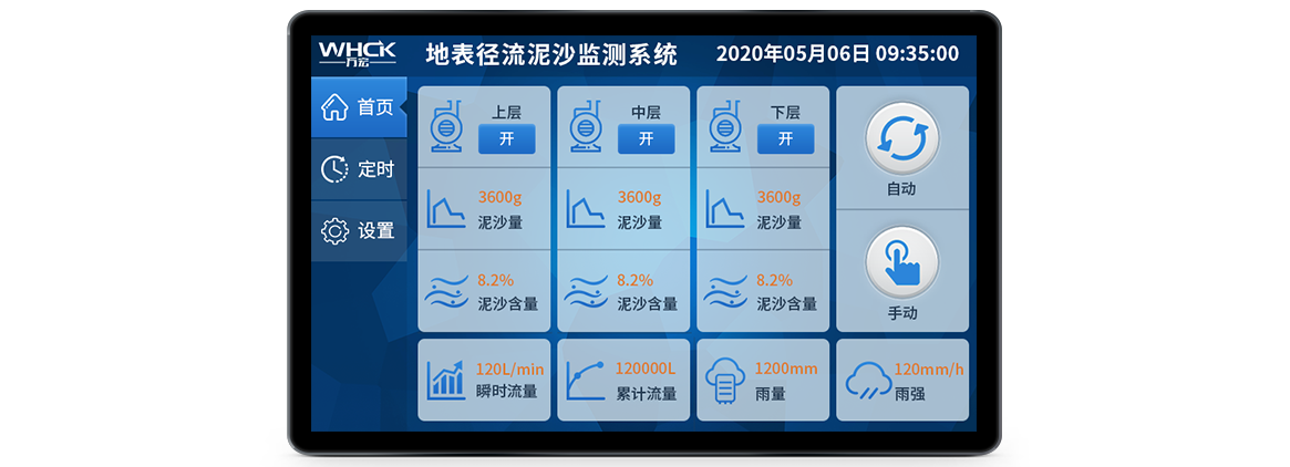 为了满足教育研究机构和科学研究机构对实时降雨的需求,今年会测控自主研发了地表径流泥沙监测系统,该系统用于径流站,为各种实验提供监测条件。相应配套触摸屏软件可以实时显示当前瞬时流速和瞬时流量,并且通过触摸屏配套软件可以实时控制整个监测的过程,可以通过查询方式查询历史数据,并能导出数据到Excel格式文件等功能。